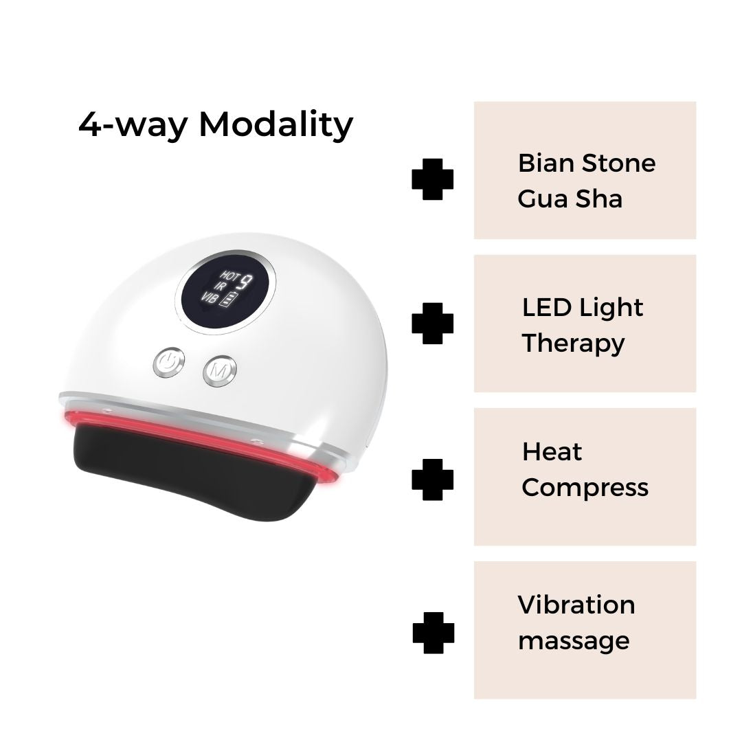 Unser 4-in-1-Gerät kombiniert Gua Sha, LED-Licht, Wärme- und Vibrationstherapie, um Ihre Haut zu entspannen, mit neuer Energie zu versorgen und zu regenerieren.