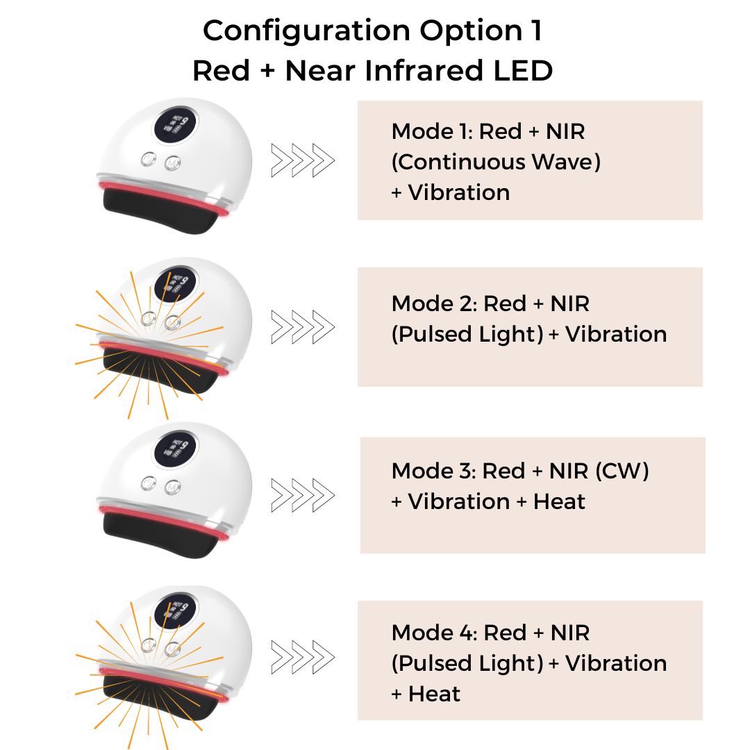 Variante 1 - Rot + Nahinfrarot Modus 1: Rot + Nahinfrarot [IR] + Vibration [VIB] Modus 2: Rot + Nahinfrarot [IR] + Vibration [VIB] – Gepulstes Licht Modus 3: Rot + Nahinfrarot [IR] + Vibration [VIB] + Wärme [HOT] kontinuierliche Wellenlänge. Modus 4: Rot + Nahinfrarot [IR] + Vibration [VIB] + Wärme [HOT] – gepulstes Licht.Die Modi sind individuell wählbar. Pulsierendes Licht wird für eine optimale Aufnahme von Hautpflegeprodukten empfohlen. Wärme und Vibration fördern die Mikrozirkulation. Die Wärmefunktion kann bei Bedarf abgeschaltet werden.
