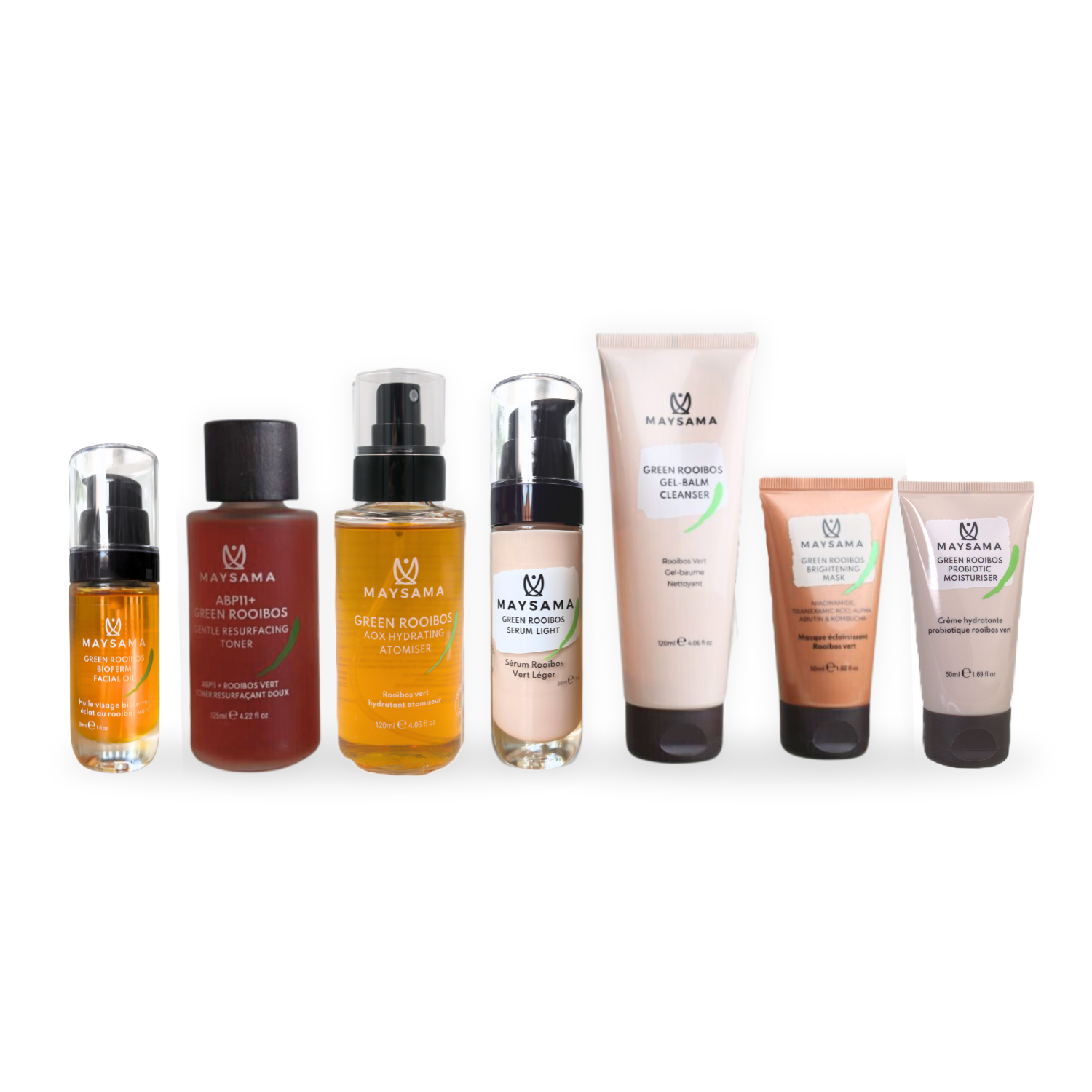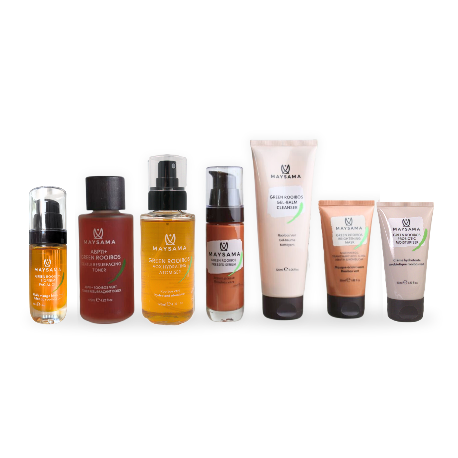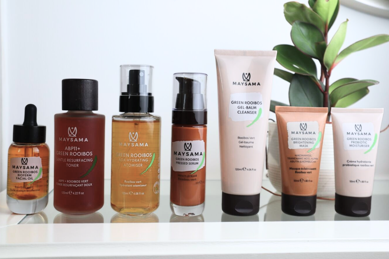 Alle Formulierungen sind mit Maysamas charakteristischem, mit Aspalathin angereichertem Grünem-Rooibos-Extrakt angereichert, um einen starken antioxidativen Schutz zu bieten und die Ergebnisse der Rotlichttherapie zu verbessern.