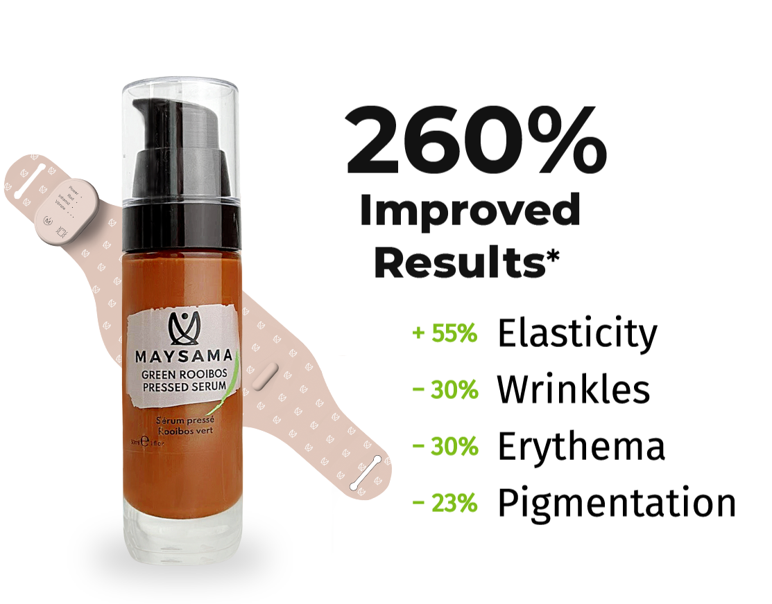 Aspalathin-enriched Green Rooibos Extract is a unique Active Pharmaceutical Ingredient [API] and the hero ingredient in Maysama skincare. Maysama Green Rooibos Pressed Serum is proven to MORE THAN DOUBLE outcomes for skin rejuvenation when used in combination with LED Light Therapy treatments.